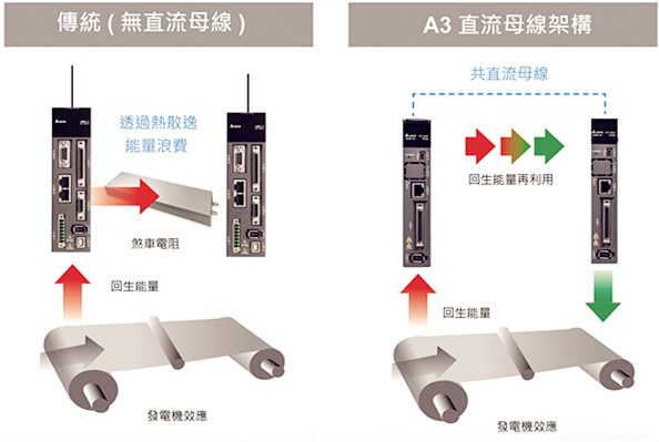 多軸共直流母線設(shè)計(jì),保持直流母線電壓穩(wěn)定,回生能量再利用,機(jī)械設(shè)備更節(jié)能多臺(tái)驅(qū)動(dòng)器使用共直流母線功能,節(jié)省煞車(chē)電阻使用數(shù)量,降低成本